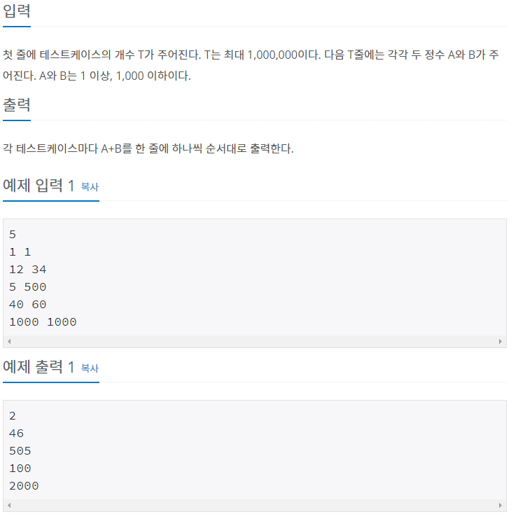 테스트케이스 개수 T를 받고 각 테스트케이스마다 덧셈을 하면 되는 간단한 문제입니다.