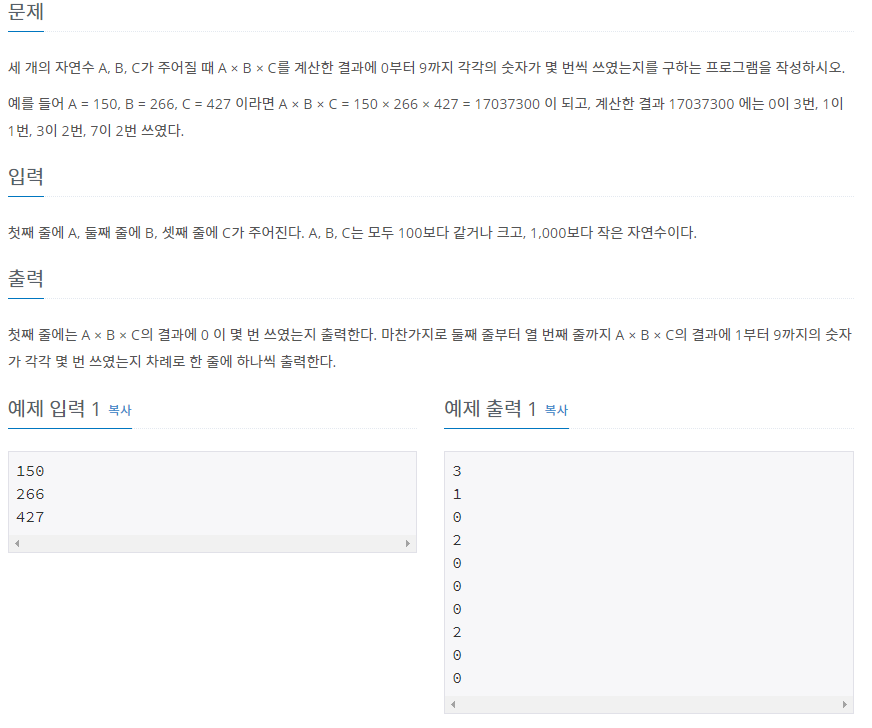 count 함수를 설명하기 위해 아래 백준 2577번 숫자의 개수 문제를 가져와봤습니다!