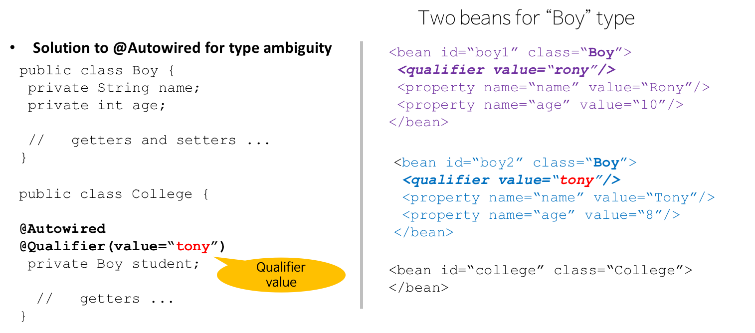 - xml 설정에서 bean의 한정자 값(qualifier value)을 설정