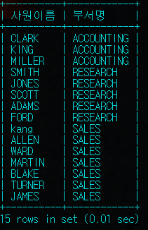select e.name as 사원이름, d.name as 부서명 from employee as e inner join department as d on e.deptno = d.deptno;