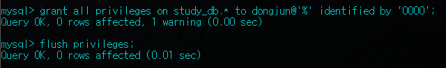 grant all privileges on db이름.* to 계정이름@'%' identified by '암호’; grant all privileges on db이름.* to 계정이름@'localhost' identified by '암호’; flush privileges;
