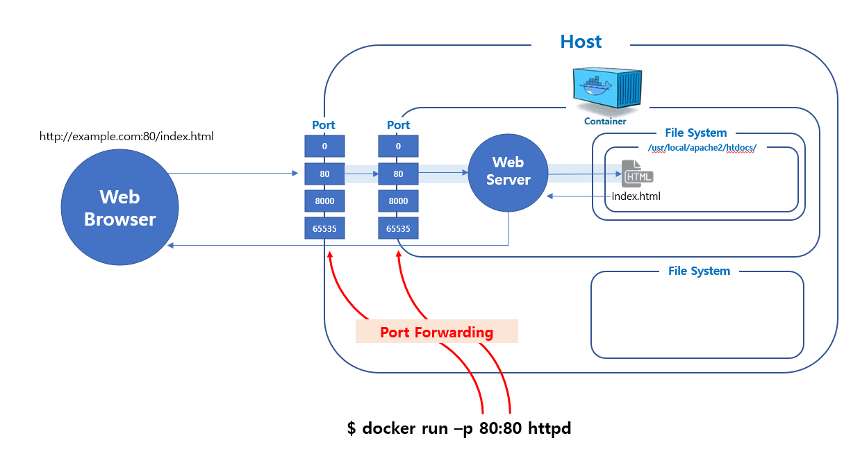 웹 브라우저에서 url을 입력하면 Host의 해당 포트번호로 요청이 전달된다. 컨테이너와 Host를 연결하기 위해서는 포트포워딩을 통해 연결해줘야 한다(ex. docker run -p 80:80 httpd).