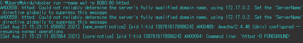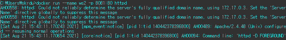 docker run --name ws1 -p 8080:80 httpd