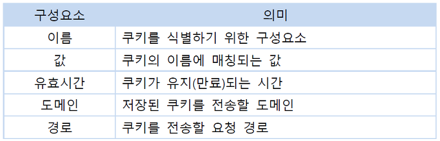 이름, 값, 유효 시간, 경로 등을 포함하고 있고, 클라이언트의 상태 정보를 브라우저에 저장하여 참조한다.