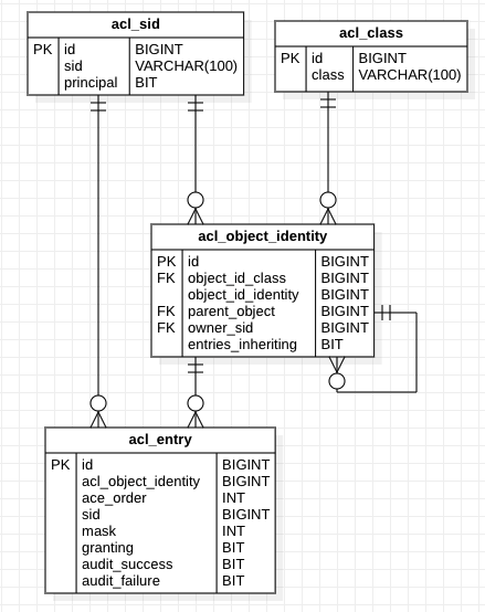 - acl_object_identity : 객체 id 지정, links to acl_object_identity table